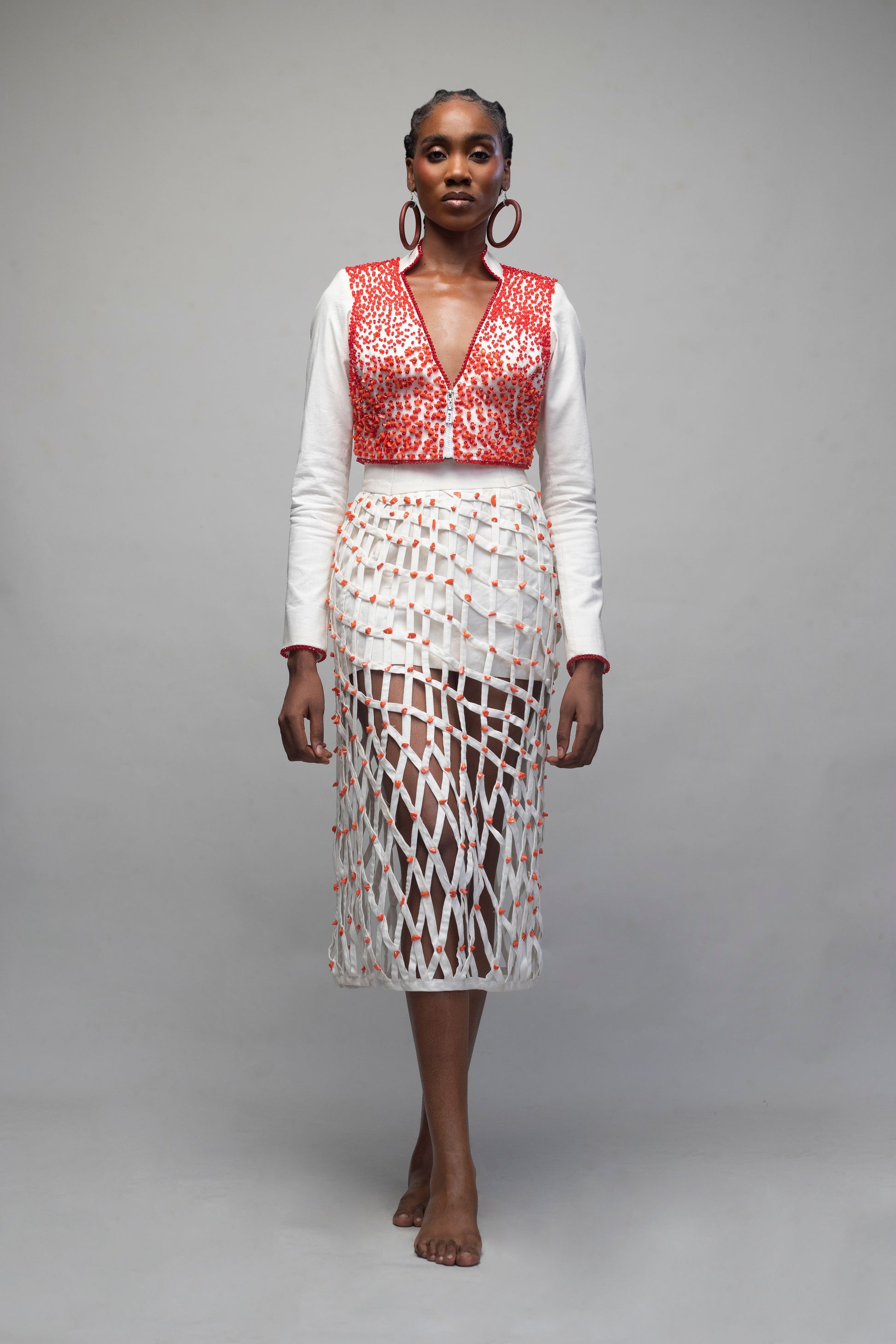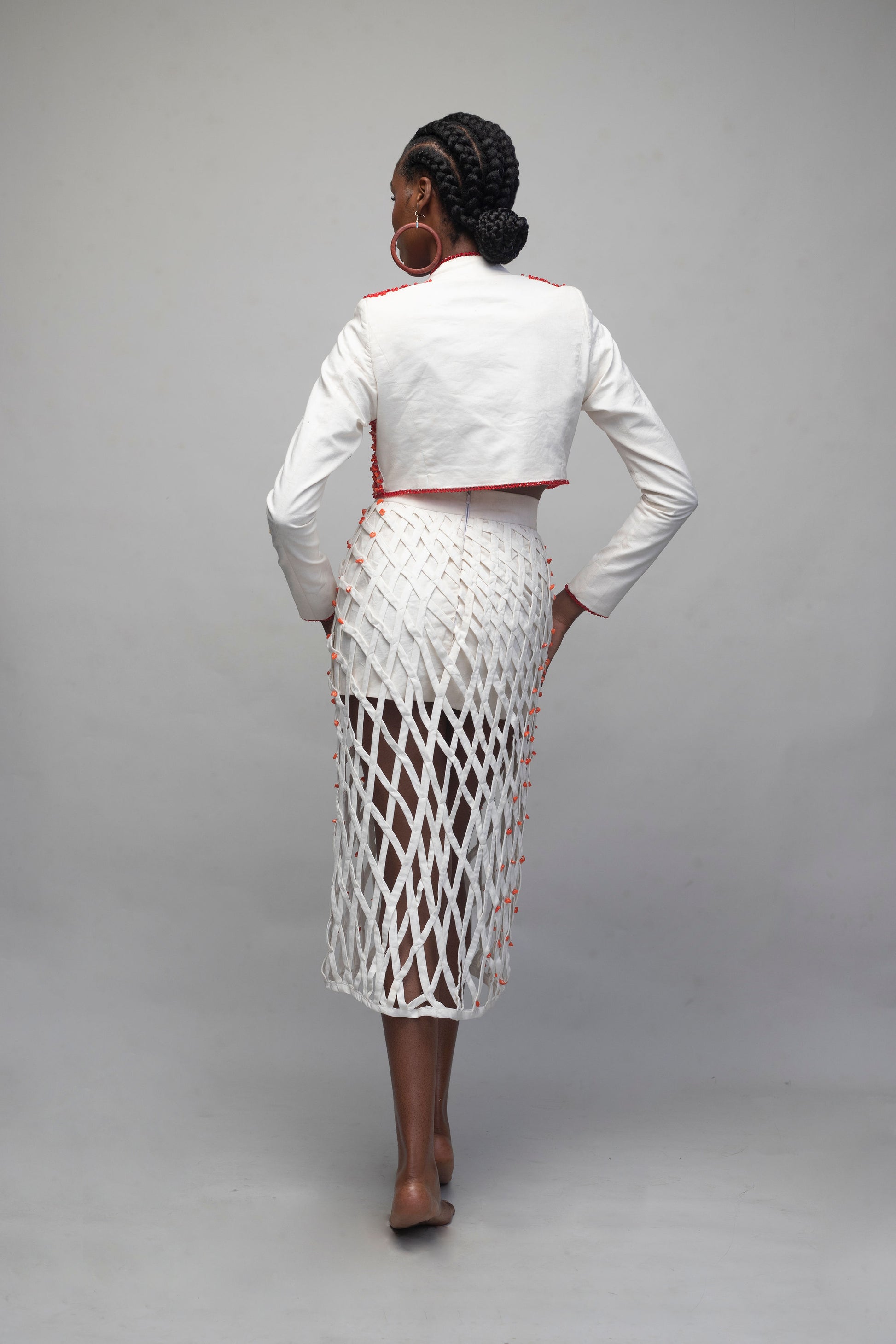 The Ari Crop Jacket and Skirt Set by Cynthia Abila is crafted from locally processed cotton fabric, celebrating the beauty of hand-finished detail and Nigerian craftsmanship. The cropped jacket features intricate beadwork, delicately hand-applied to create texture, depth, and a touch of bold femininity.
