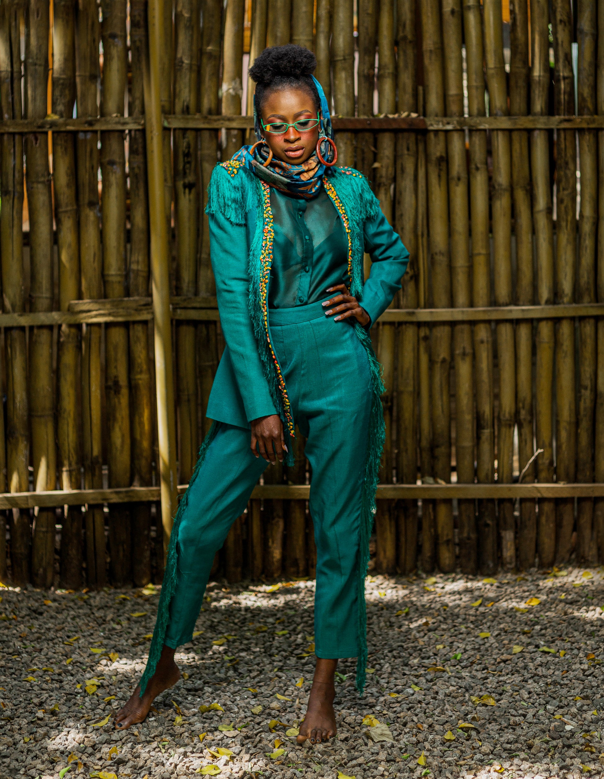 The Cynthia Abila designed coral beaded 2 piece is made from 100% woven emerald green silk with coral beaded embellishments. Also featuring silky fringe details on the plackets and shoulders. It has two button front closure, Long sleeves and matching polyester inner lining.