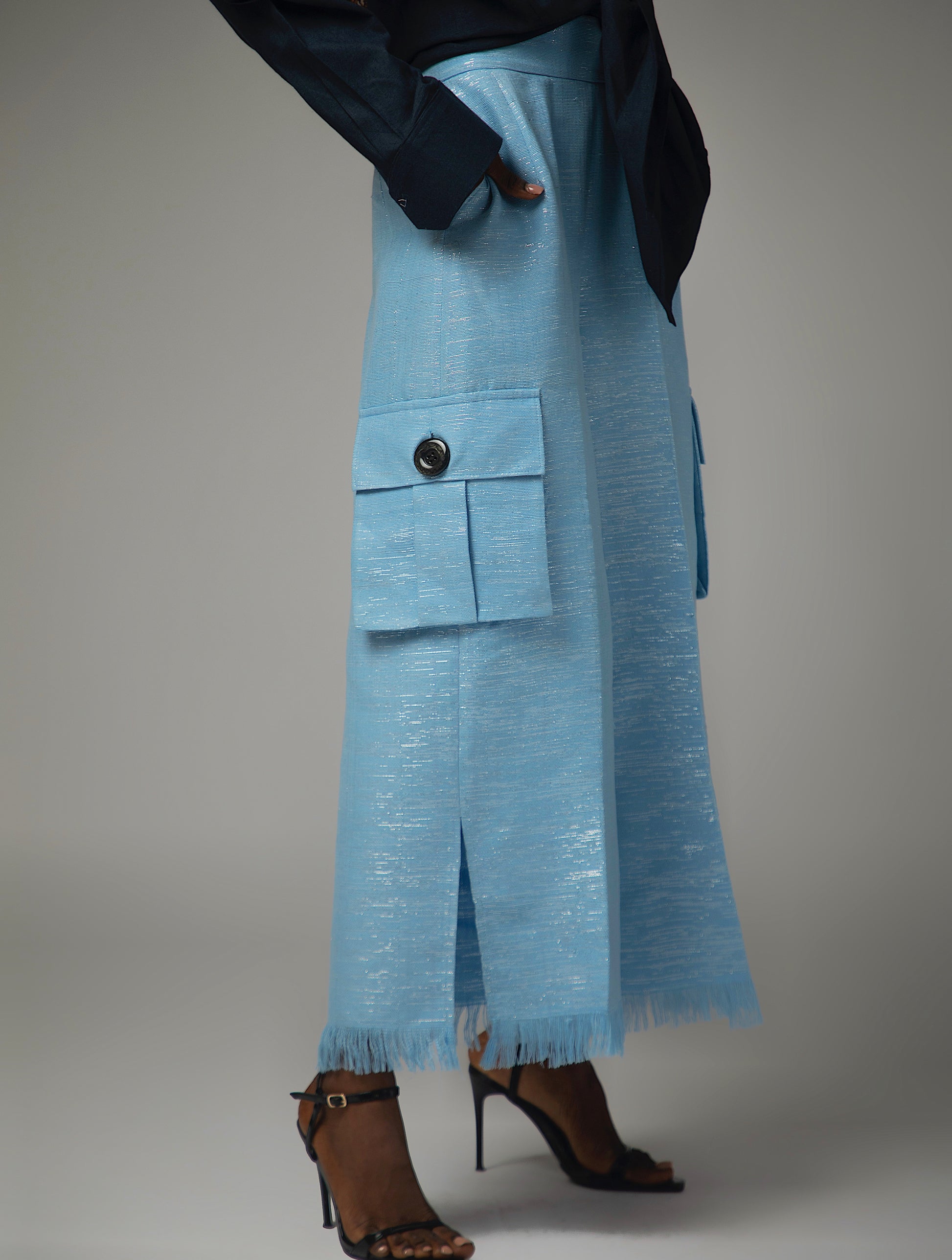 The pants are hand-woven with blue and silver yarns for a shimmering effect. Plus, combat pockets and side slits add functionality and style. Can be paired with the Navy linen Shirt