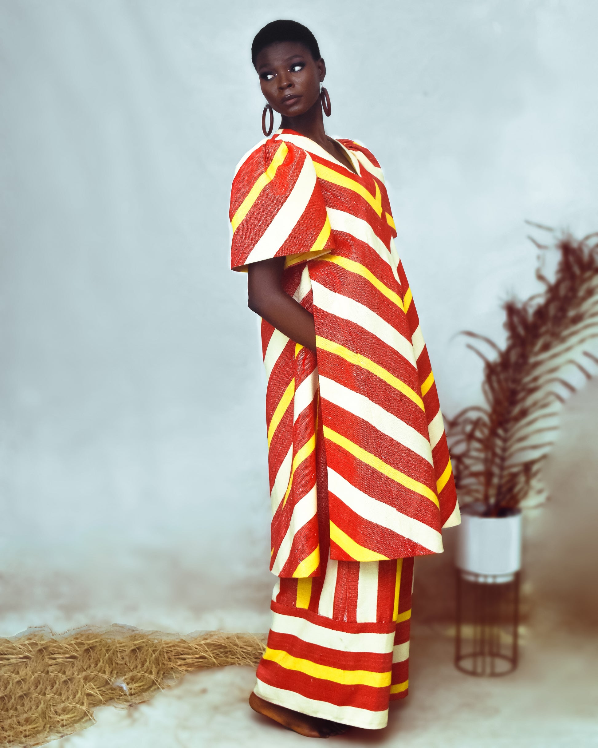 A striking harmony of bold color and timeless tradition, the Hura Two-Piece is a vibrant nod to cultural artistry and contemporary femininity. Made from Njam fabric, handwoven by indigenous Nigerian women, this set is rich with character—featuring bold red, white, and yellow bold stripes that exude strength, warmth, and joy.