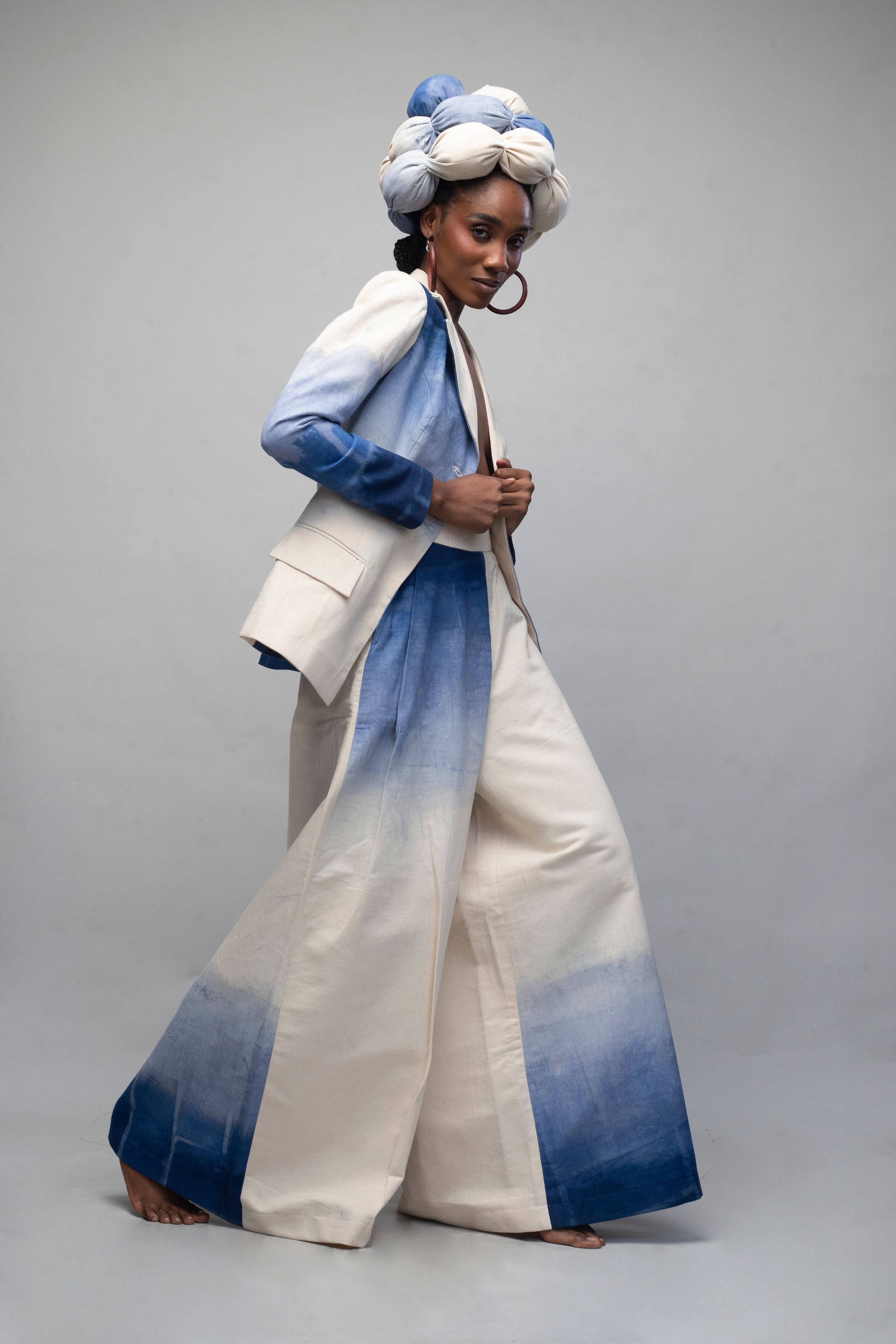 The Ini Jacket and Pant is a clean, modern ode to dye artistry and architectural tailoring. It features a Structured Jacket paired with Wide-Leg Painterly Trousers, both crafted in hand-dyed cotton with a soft gradient that shifts from ivory into layers of sky and ocean blues. The result is a look that feels serene, powerful, and deeply textural. Two-piece set: Blazer + high-waisted wide-leg trousers