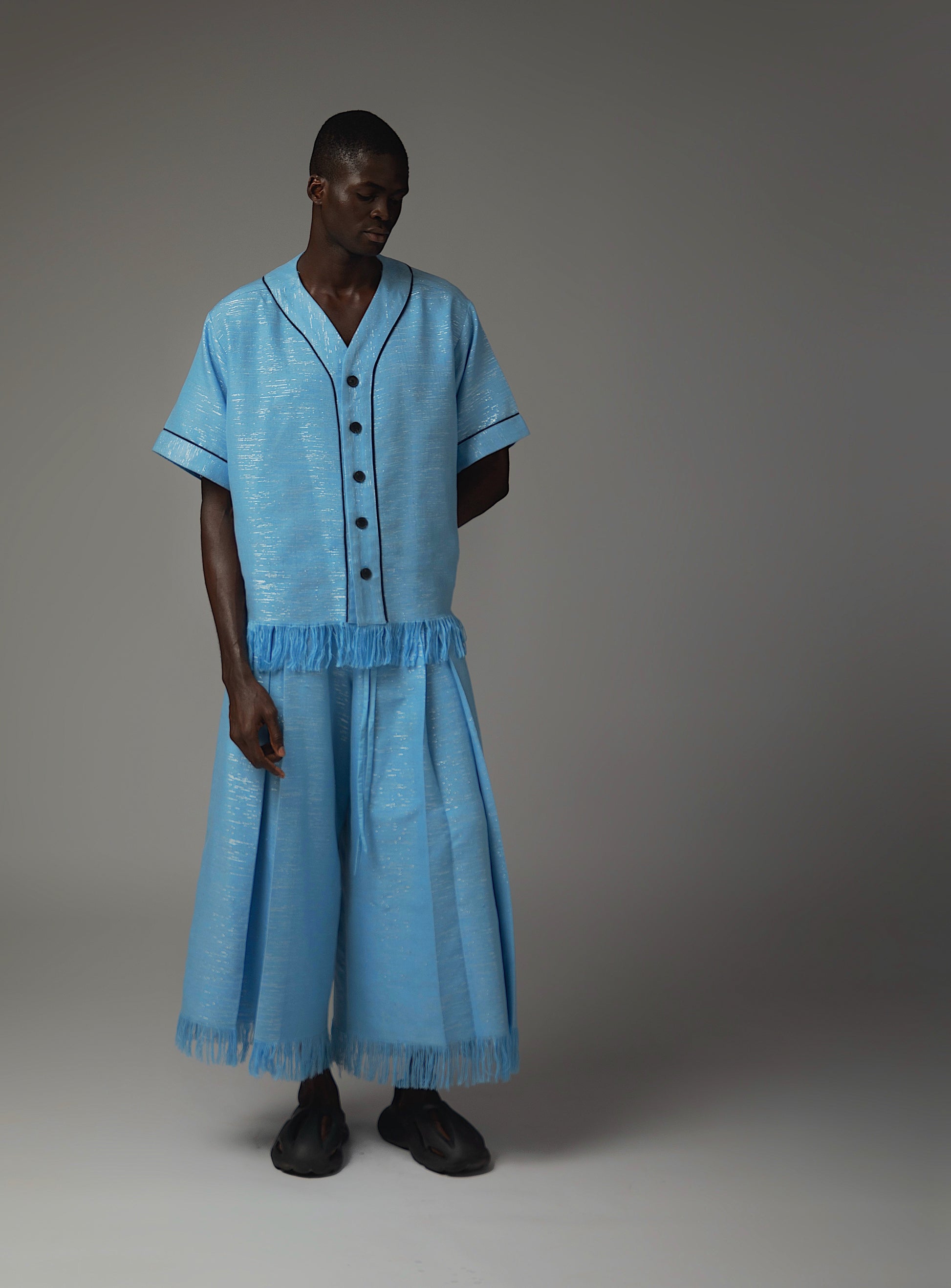 Elevate your style with the Kala 2-piece set. Made from hand woven cotton fabric by indigenous female artisans, it features a wide leg pant with front pleats and a short sleeve shirt with fringed edges. Embrace comfort and fashion with this unique and versatile outfit!