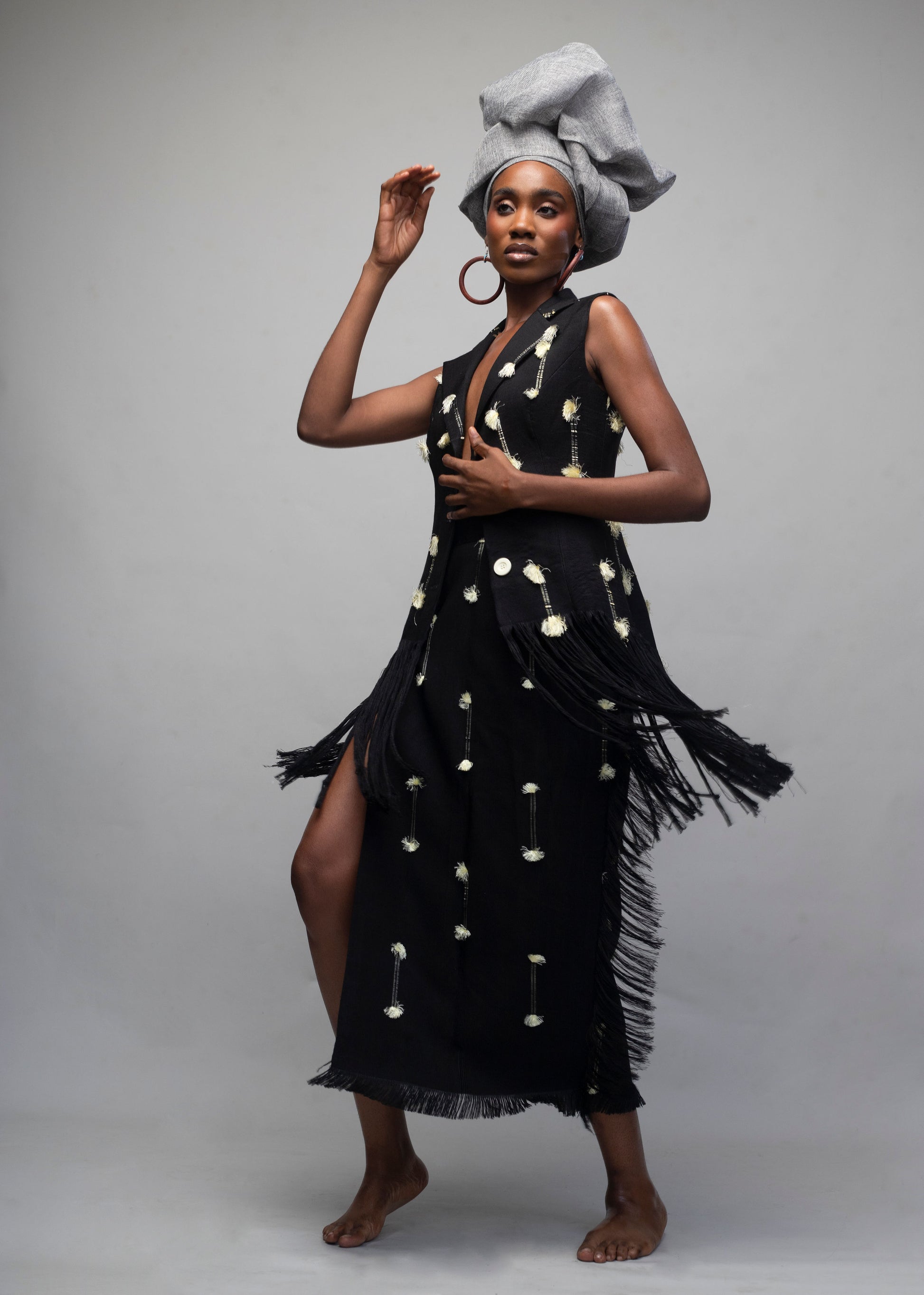 The sleeveless jacket is cut in a clean, tailored silhouette with bold cream buttons and soft fringed edges that speak to quiet sophistication. Its matching skirt, complete with a daring slit, flows with confidence and ease — a timeless balance of strength and femininity.
