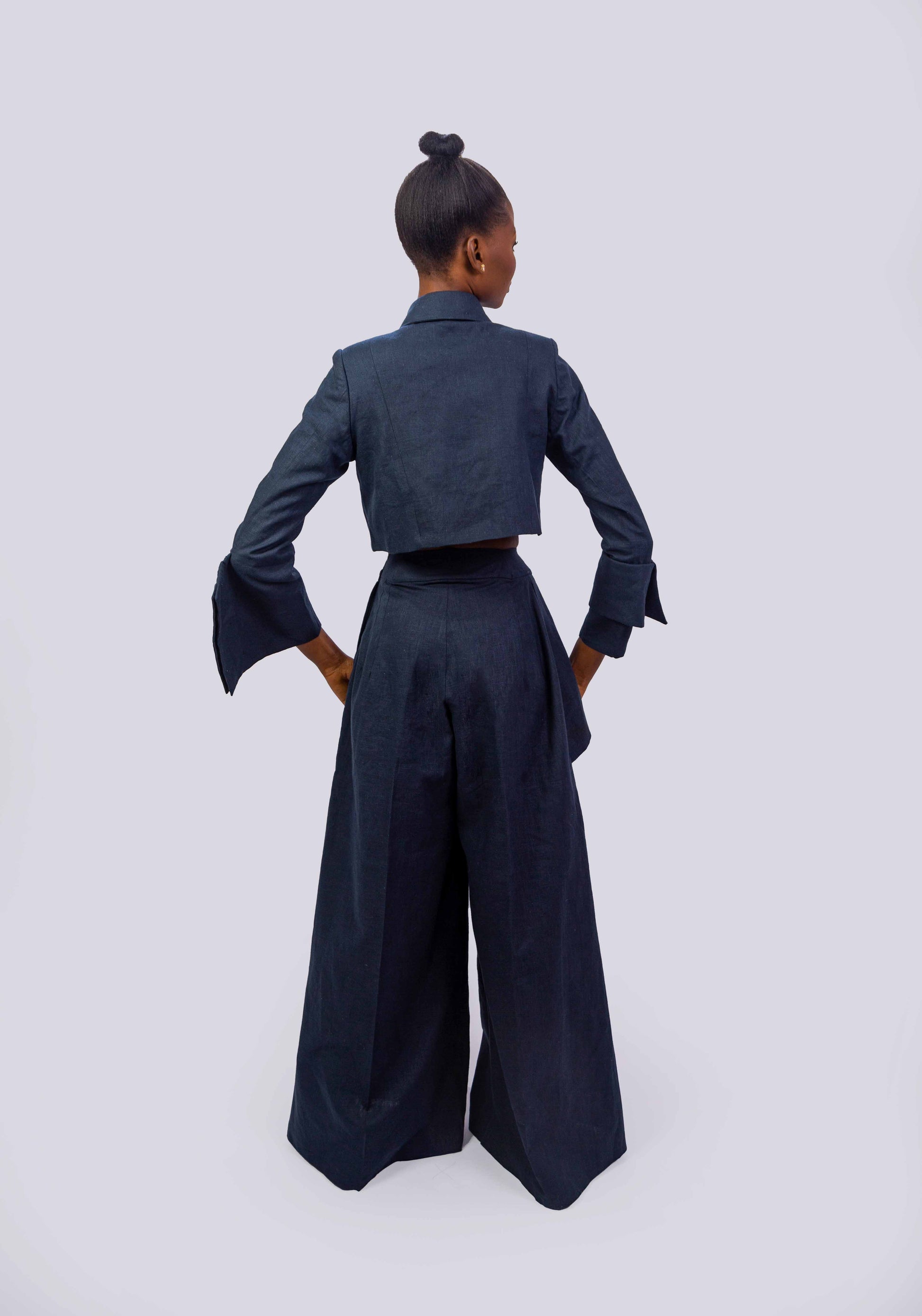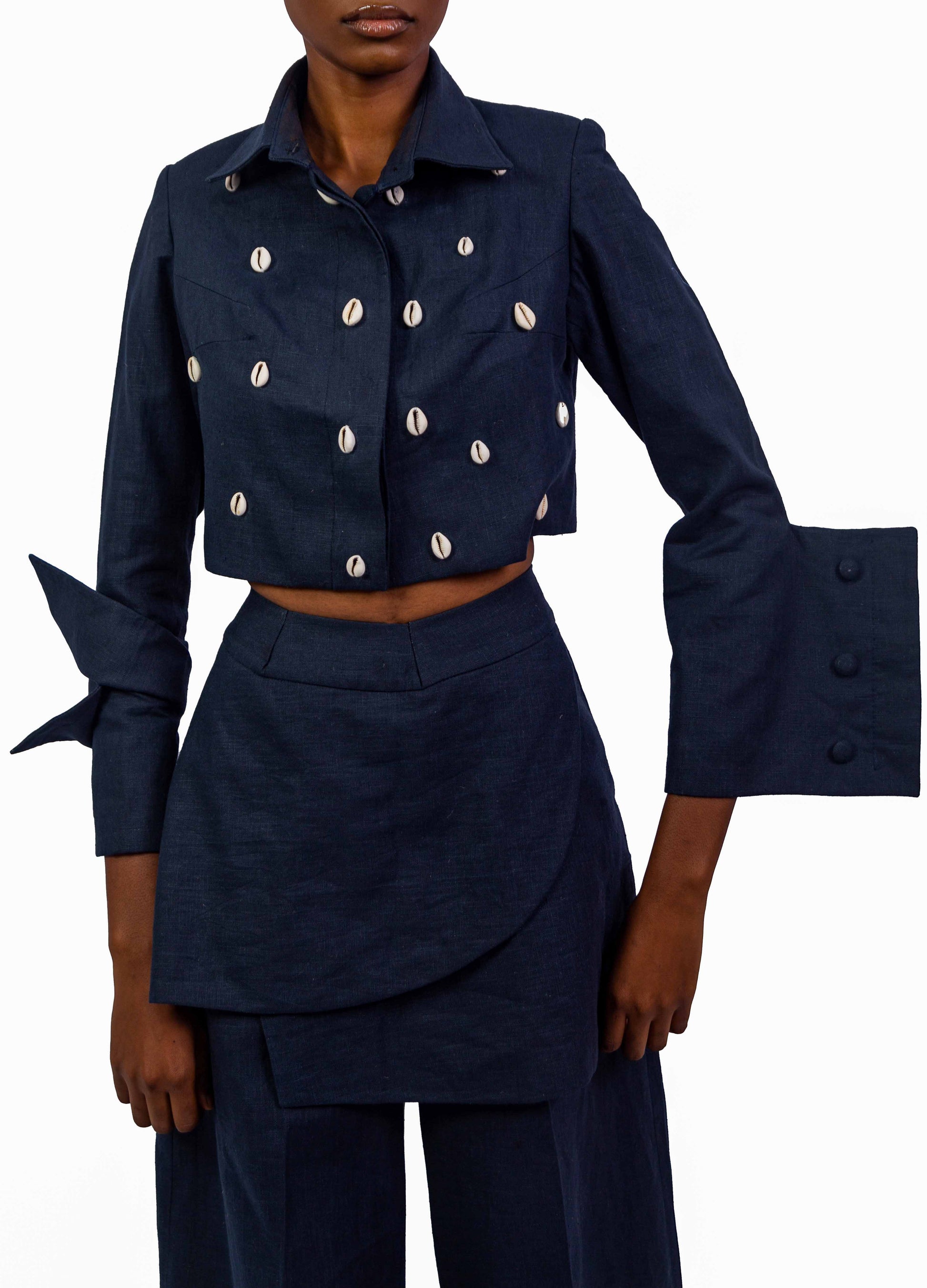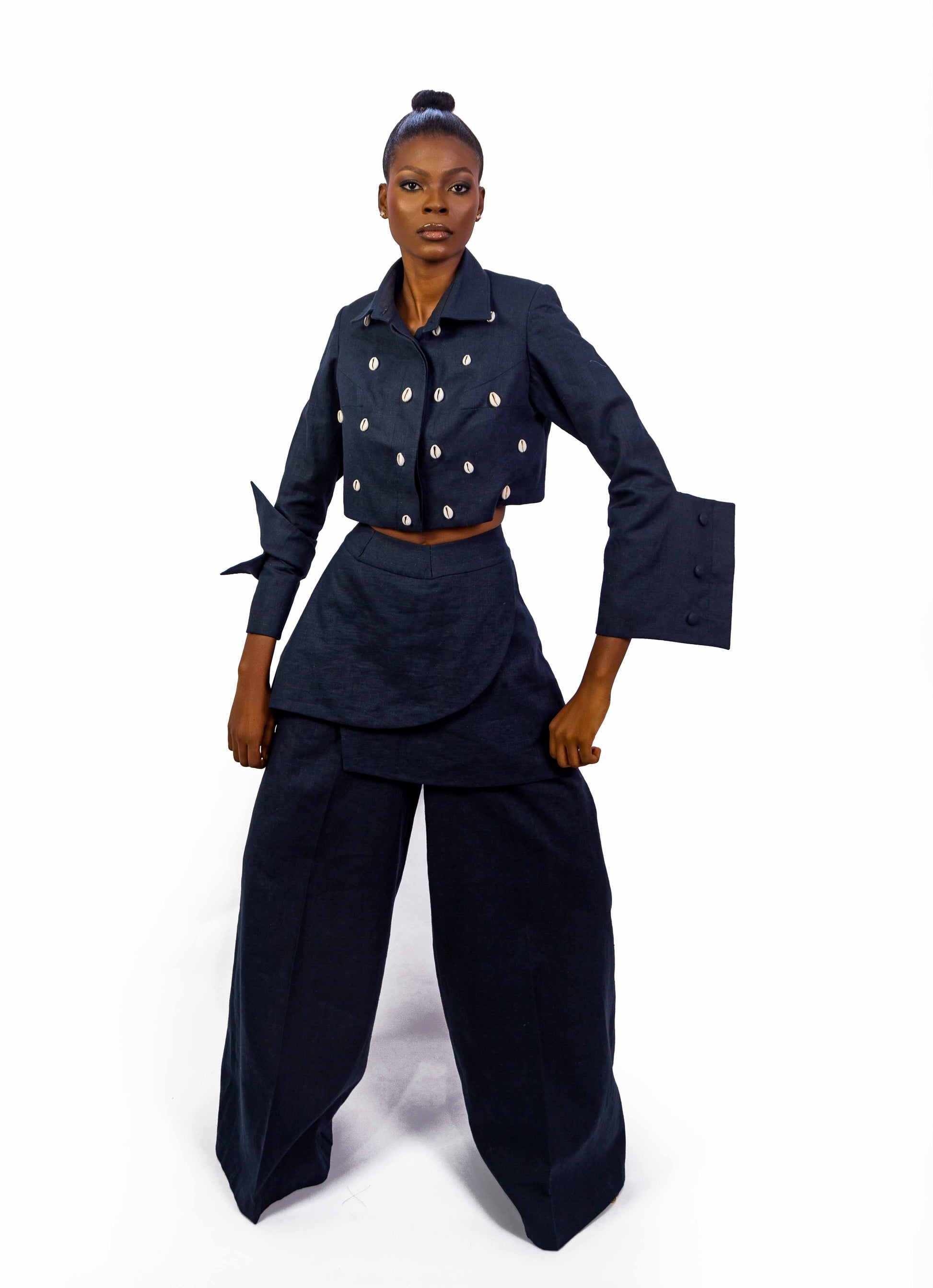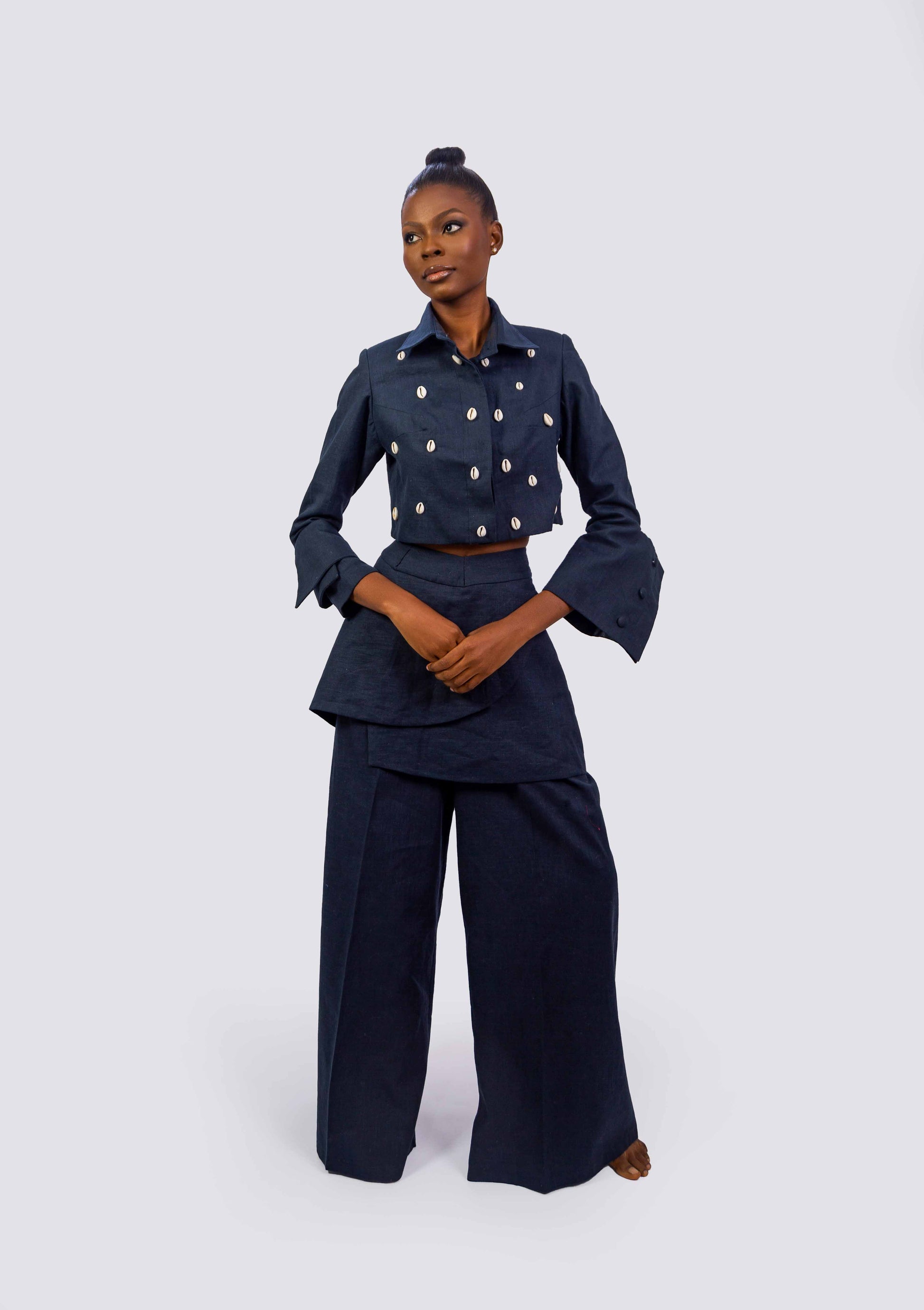 The Cynthia Abila-designed Nri Top and pant is an African-designed two-piece set featuring a midriff top and elegant full-length overlay pants. The long sleeve midriff top is adorned with elegant hand-sewn cowries which signifies wealth and fullness. The sleeves consist of elegant detailed bold cuffs