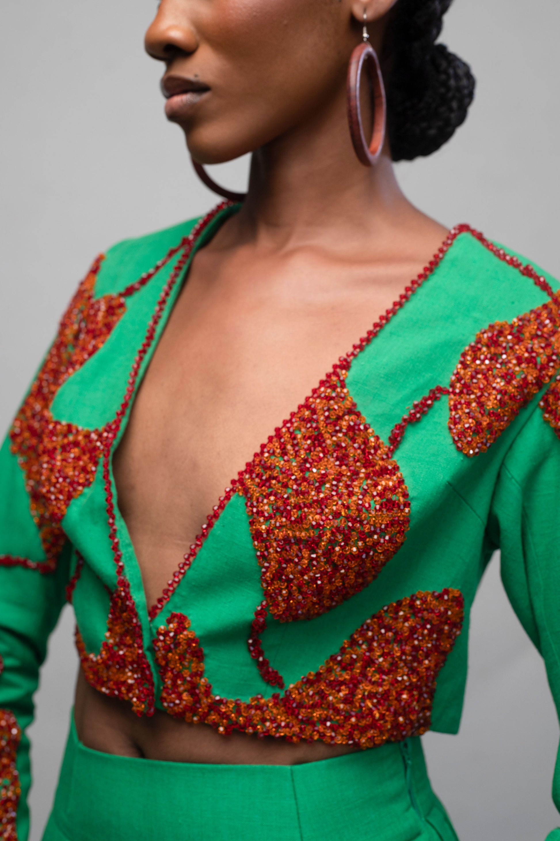 The Otu Green Crop Jacket and Pant set merges fluid tailoring with intricate hand-embellishment. The Embellished Cropped Jacket features an ultra-deep V neckline and a confident cropped silhouette, adorned with textured beadwork in an organic, wave-like formation across the bodice and sleeves. Each bead panel is hand-applied, adding rich depth, colour contrast, and artisanal detail.