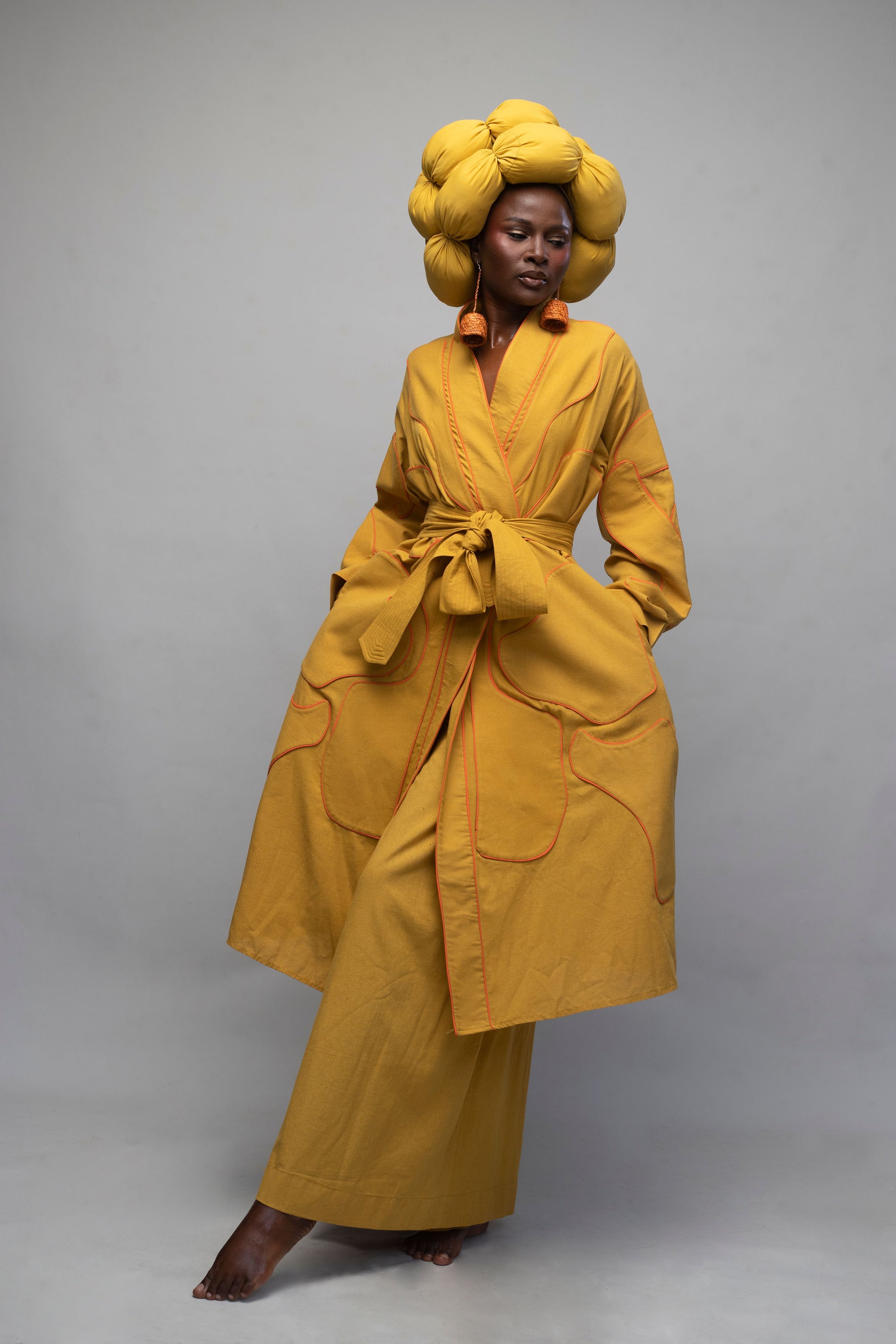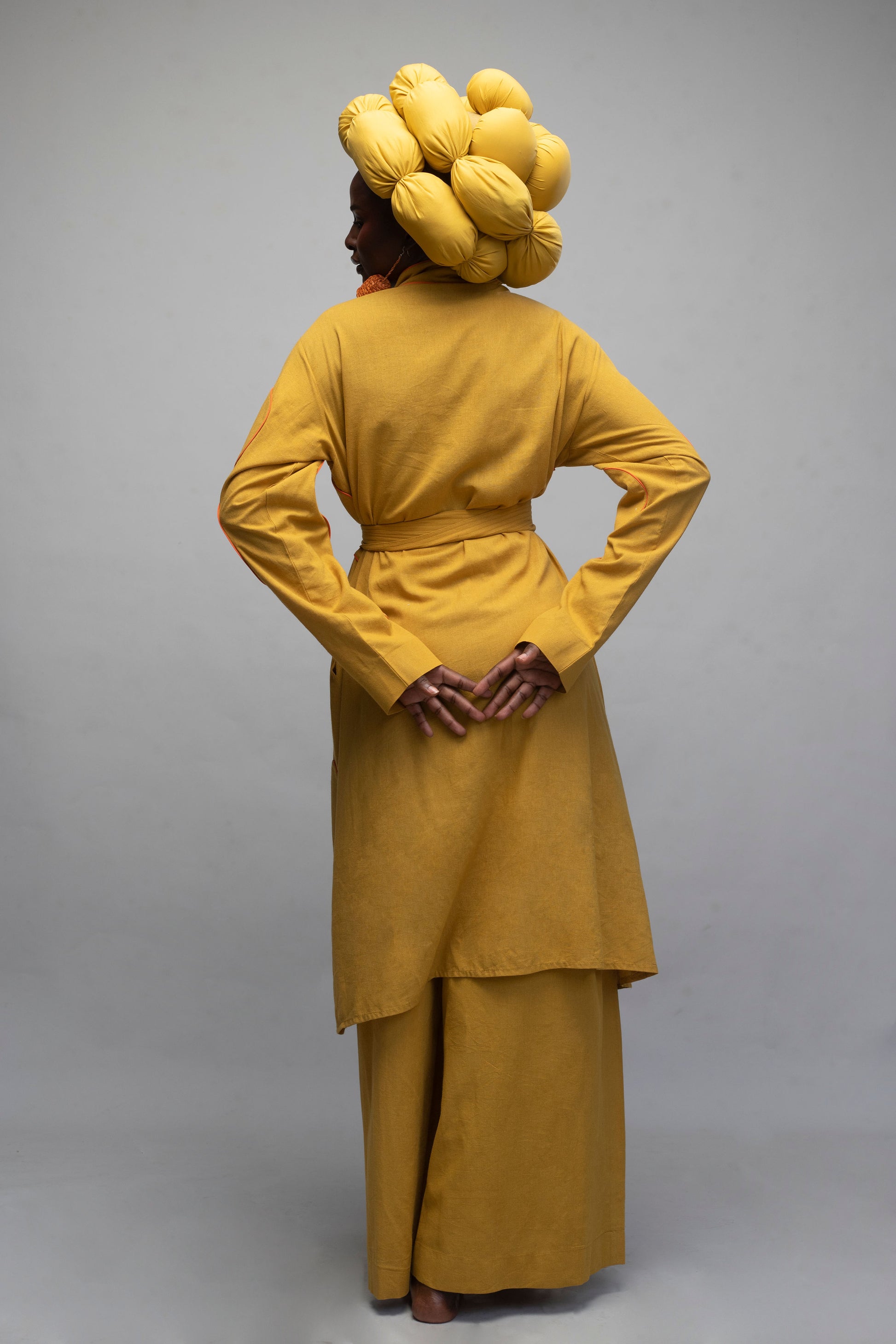 The Rayuwa Kimono and Pant set by Cynthia Abila Highlights modern African sophistication through its fluid structure and rich detailing. Crafted from lemon-gold cotton fabric, this ensemble glows with understated elegance — soft yet powerful, minimal yet expressive.