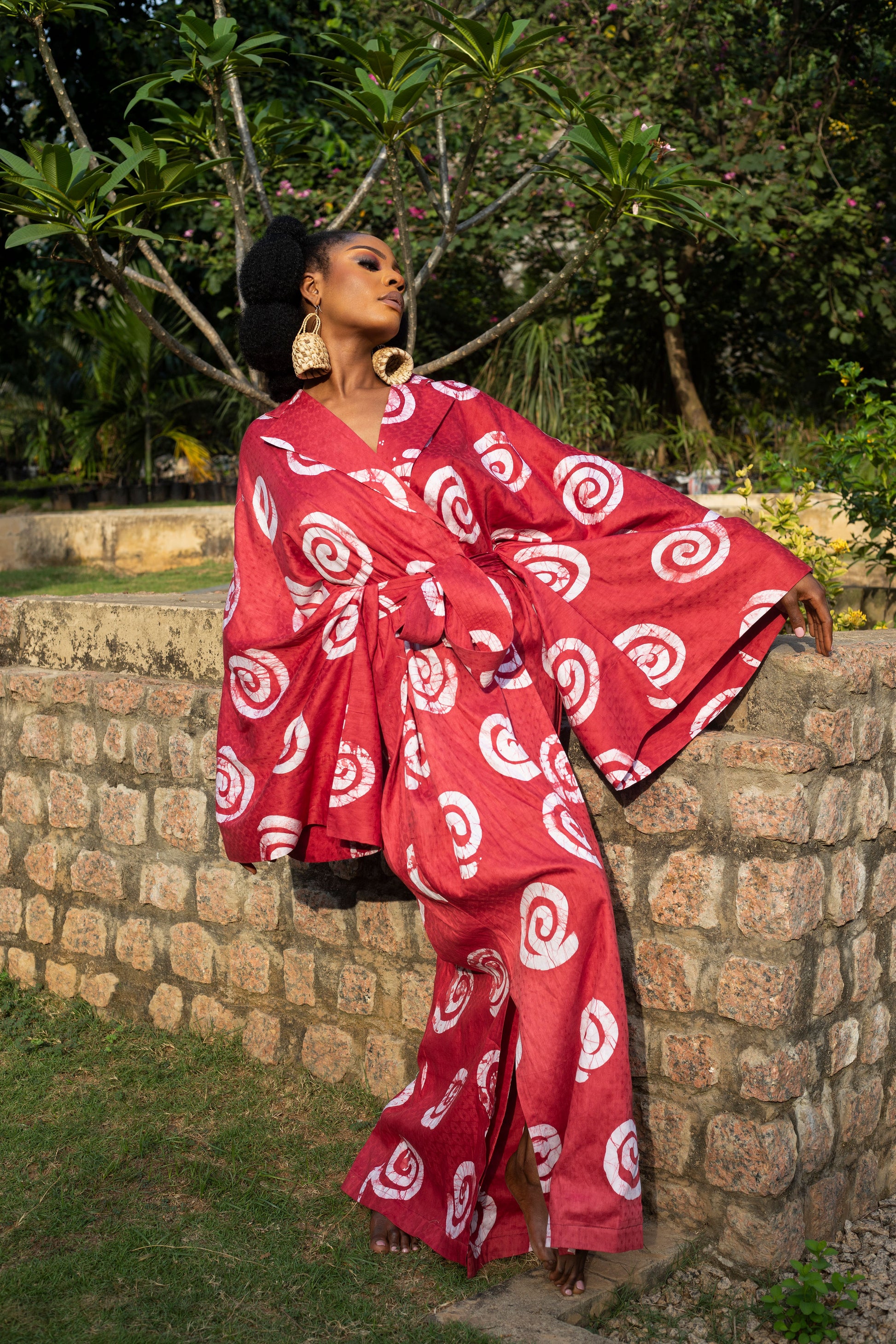 Red Spring Maxi Kimono is designed from red prints. It's a long wrap dress kimono garment that wraps around the body and ties at the waist with a belt.