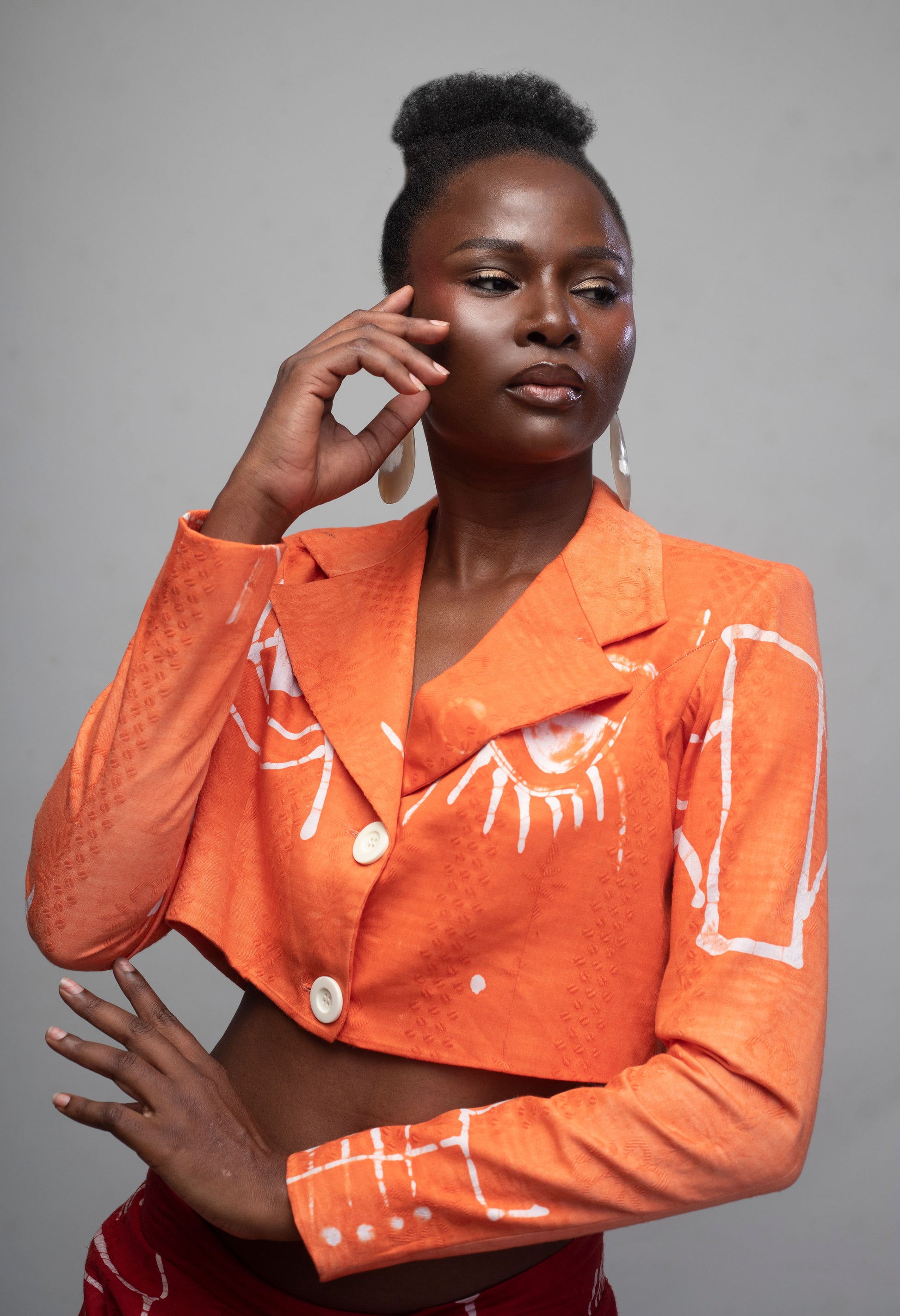 The Sisi Crop Jacket is a bold expression of modern African elegance. Hand-dyed in vibrant orange cotton adire, it carries unique white motifs that tell stories of heritage and individuality. The structured cropped silhouette with wide lapels and statement buttons brings sophistication to everyday wear while celebrating sustainable craftsmanship.