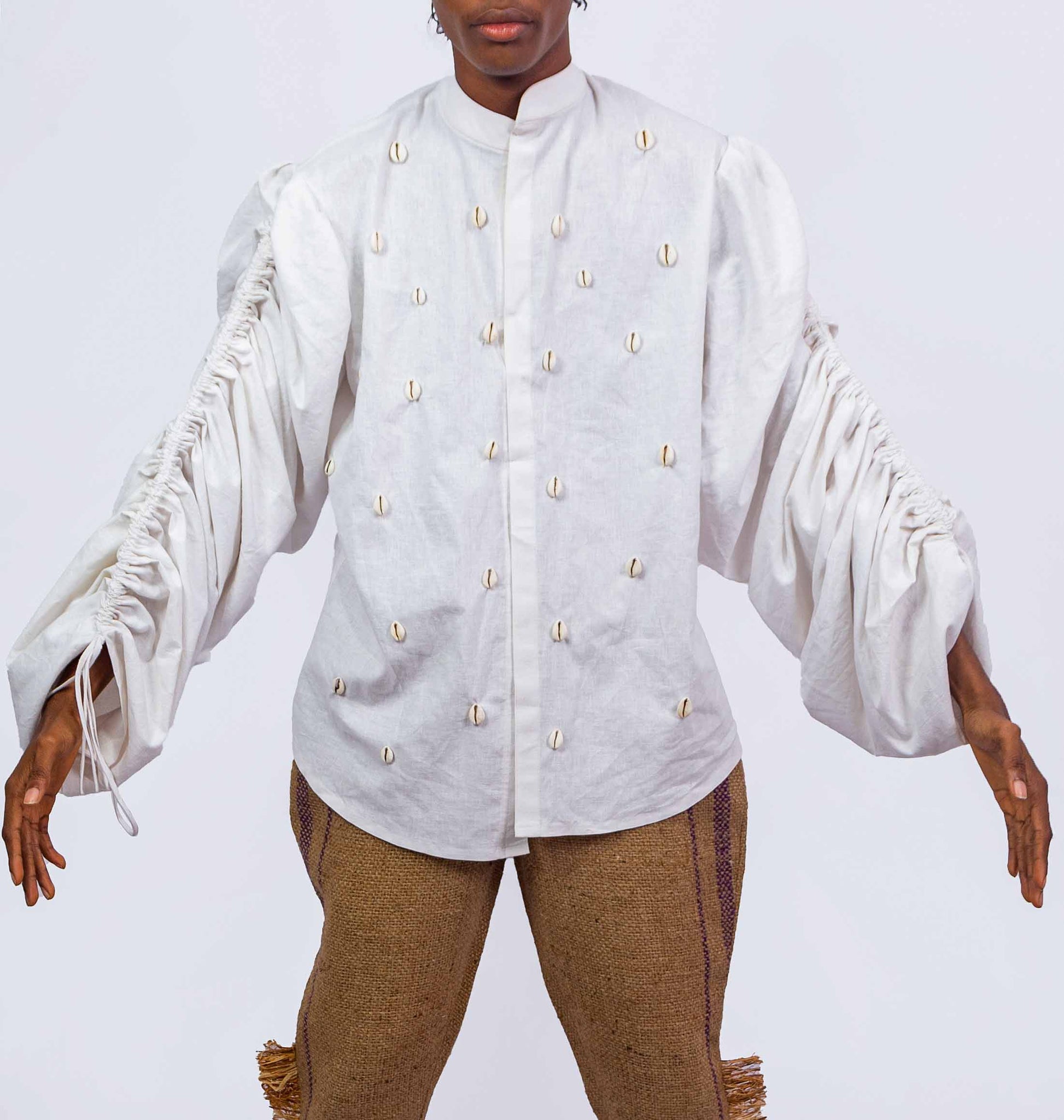 The Tudor cowries shirt expresses the brand's signature technique of rendition of cultural stories using modern trends. The top is adorned with hand-sewn cowries that signify wealth and fullness. The Tudor Cowries shirt is a button-down cosy shirt with an infusion of African design.