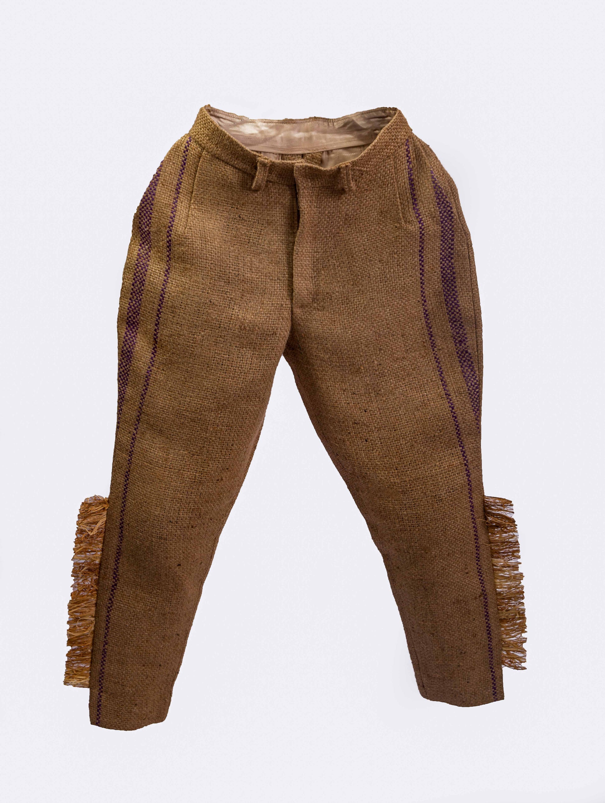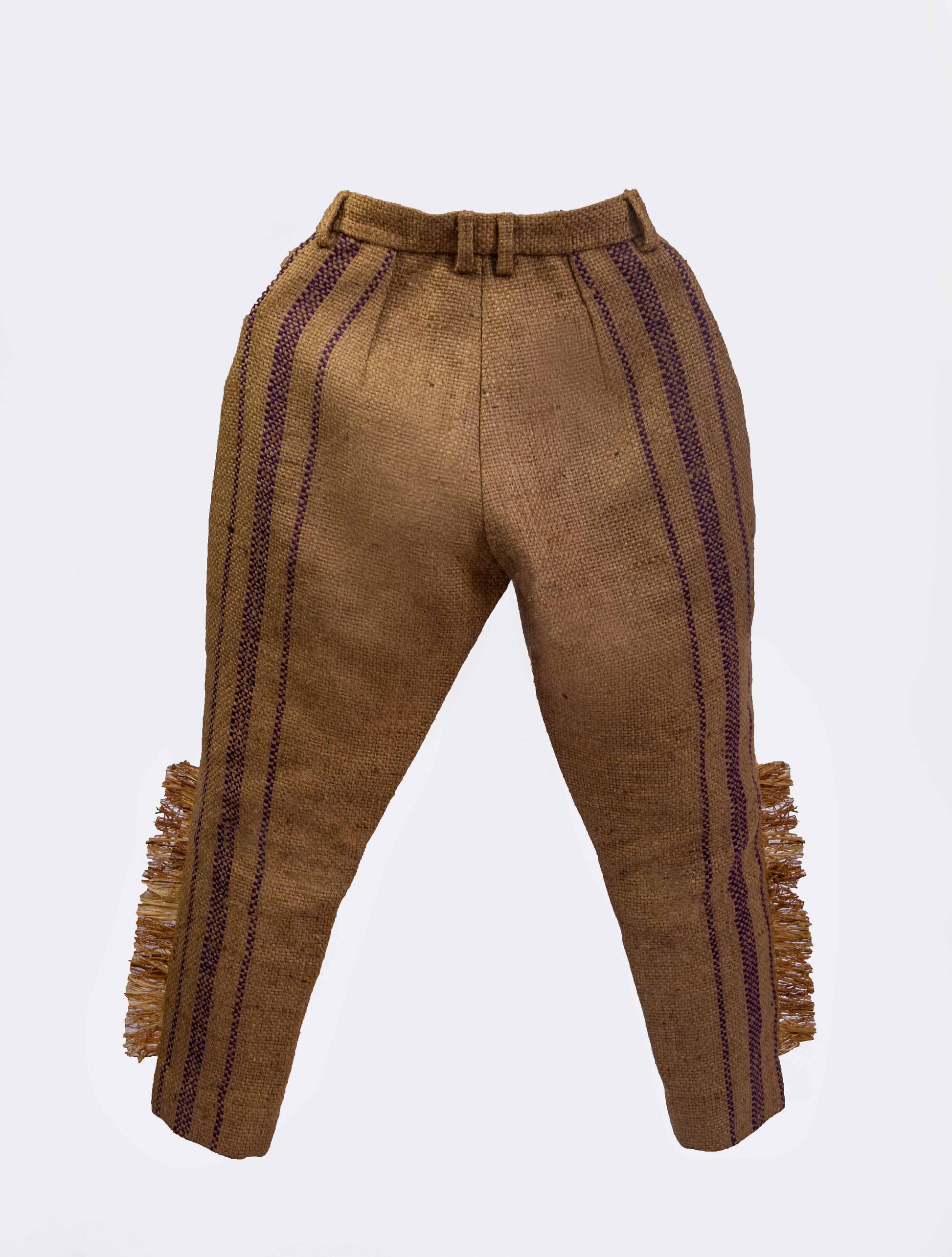 Pairs with the Jute raffia pants made from jute and raffia Fiber. The Capri pant is lined for comfort. The legs of the pants have raffia straws sewn on the sides.