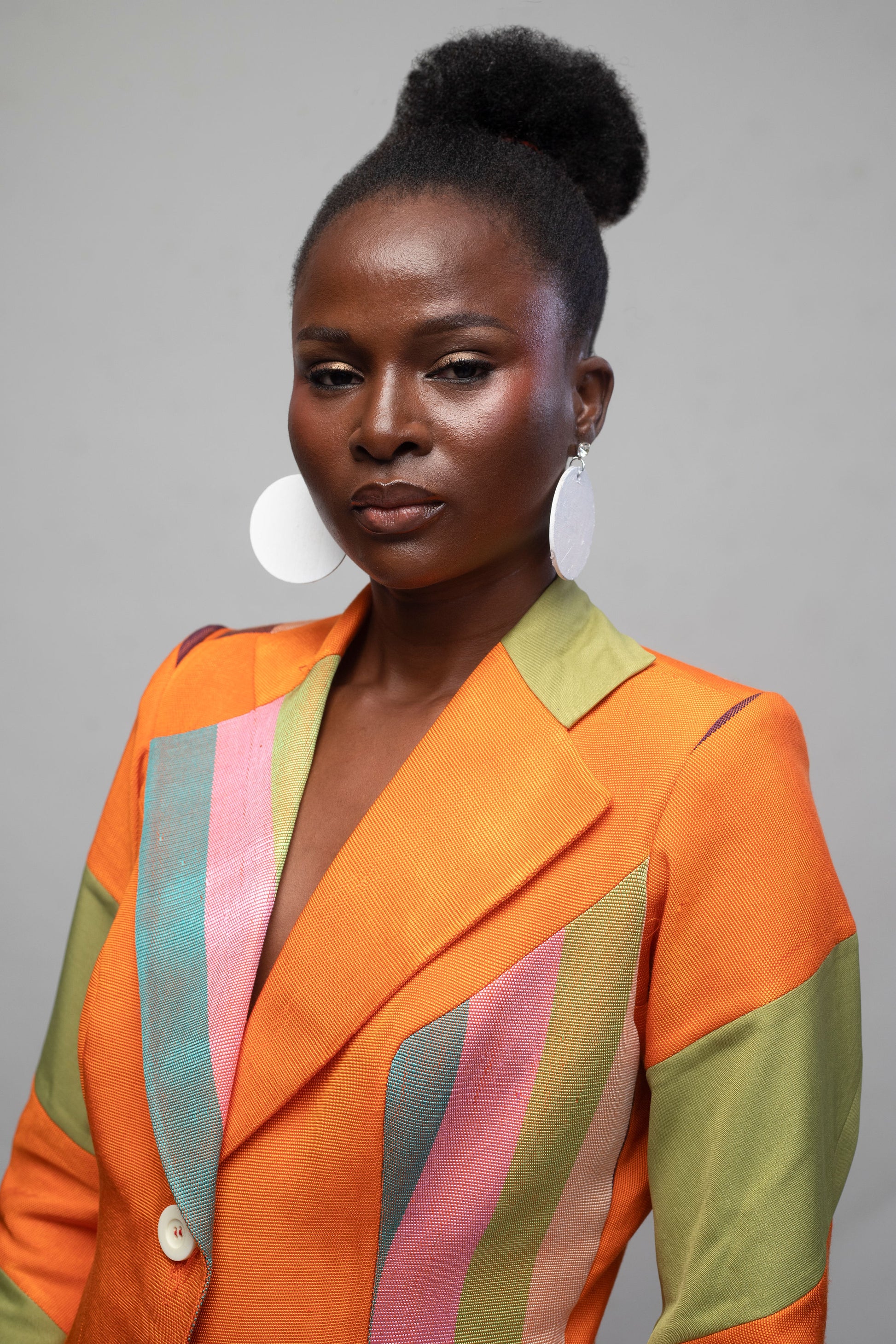 The Ugo Jacket by Cynthia Abila is crafted from locally handwoven striped njam fabric, blending vibrant orange with soft tones of pink, green, and lilac. The design brings structure and warmth to a tailored silhouette that feels both classic and daring.