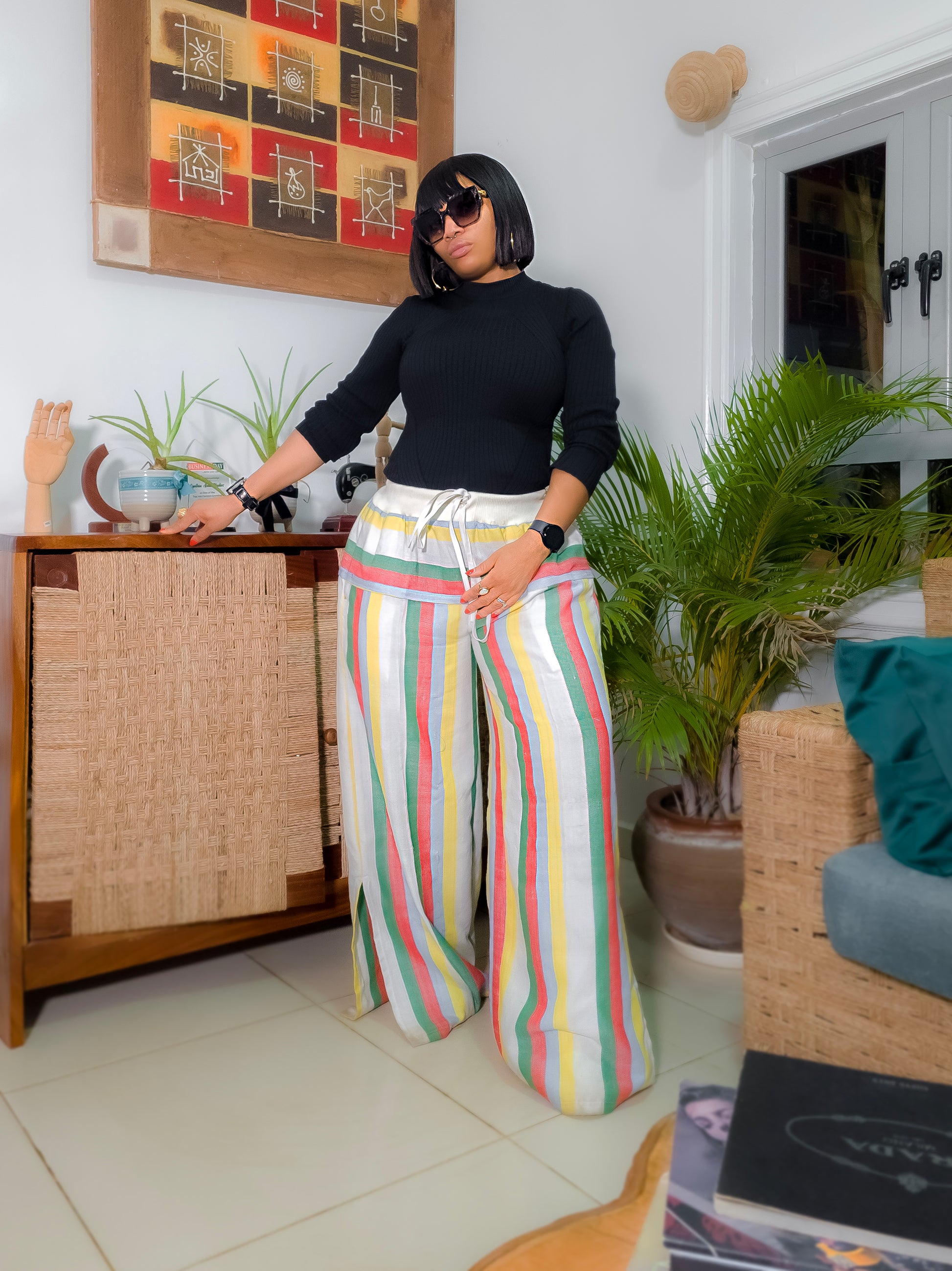 These woven multi-color stripe pants are crafted from handwoven cotton, offering both comfort and style. Featuring a tie elastic waistband for a custom fit and subtle side slits at the bottom, these pants effortlessly blend casual vibes with a touch of sophistication.